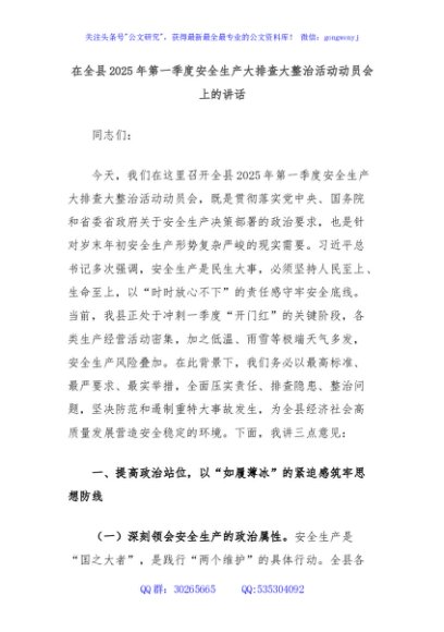 / 在全县2025年第一季度安全生产大排查大整治活动动员会上的讲话