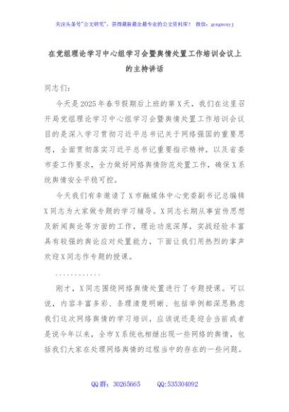 / 在党组理论学习中心组学习会暨舆情处置工作培训会议上的主持讲话
