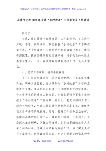 / 县委书记在2025年全县“合村改居”工作座谈会上的讲话