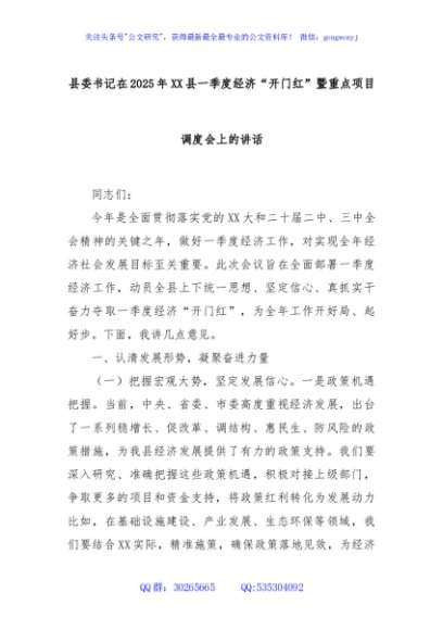 / 县委书记在2025年XX县一季度经济“开门红”暨重点项目调度会上的讲话