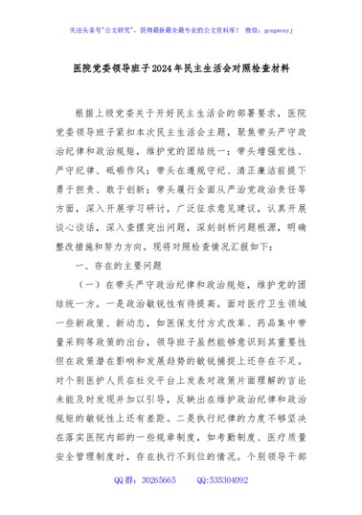 / 医院党委领导班子2024年民主生活会对照检查材料