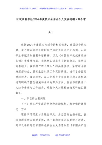 / 区政法委书记2024年度民主生活会个人发言提纲(四个带头)