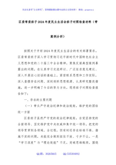/ 区委常委班子2024年度民主生活会班子对照检查材料(带案例分析)