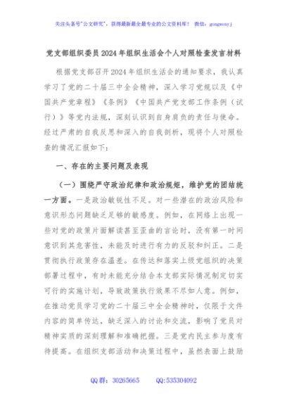 / 党支部组织委员2024年组织生活会个人对照检查发言材料
