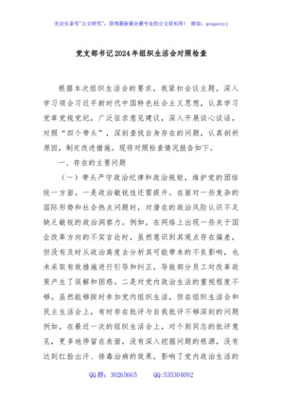 / 党支部书记2024年组织生活会对照检查