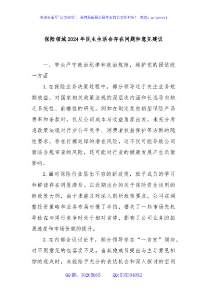 / 保险领域2024年民主生活会存在问题和意见建议