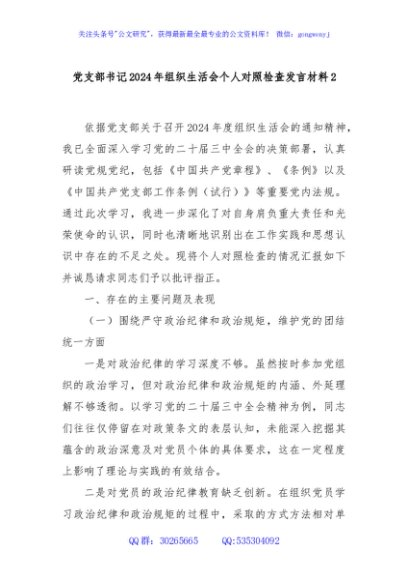 / 党支部书记2024年组织生活会个人对照检查发言材料2