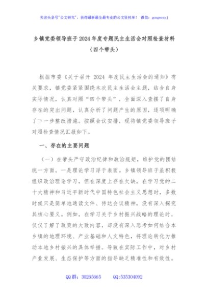 / 乡镇党委领导班子2024年度专题民主生活会对照检查材料(四个带头)