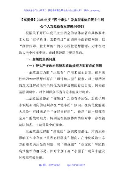 / 【高质量】2025年度“四个带头”及典型案例的民主生活会个人对照检查发言提纲0013