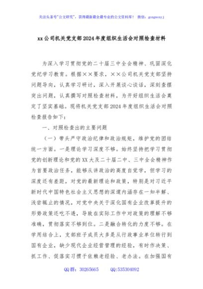 / xx公司机关党支部2024年度组织生活会对照检查材料