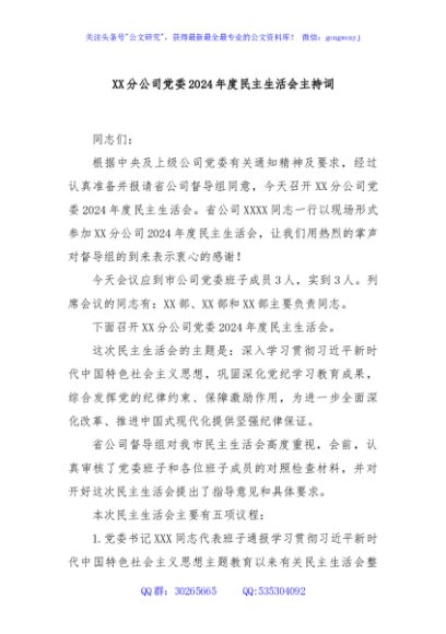 / XX分公司党委2024年度民主生活会主持词