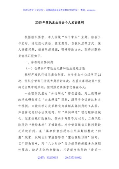 / 2025年度民主生活会个人发言提纲