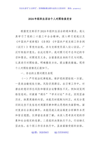 / 2024年组织生活会个人对照检查发言