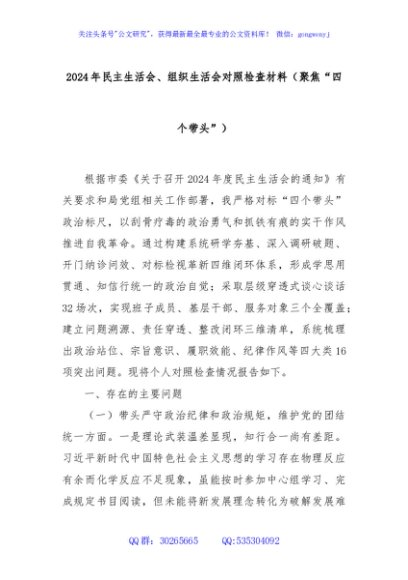 / 2024年民主生活会、组织生活会对照检查材料(聚焦“四个带头”)