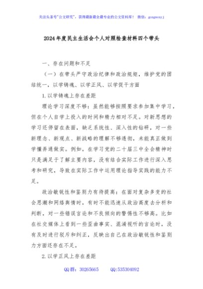 / 2024年度民主生活会个人对照检查材料四个带头