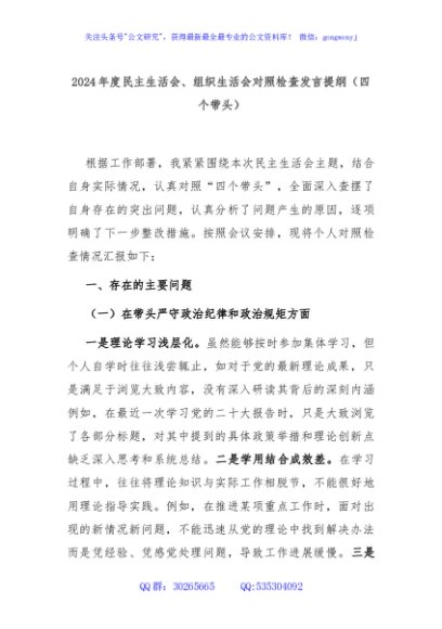 / 2024年度民主生活会、组织生活会对照检查发言提纲(四个带头)