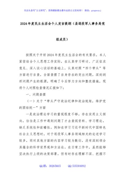 / 2024年度民主生活会个人发言提纲(县退役军人事务局党组成员)