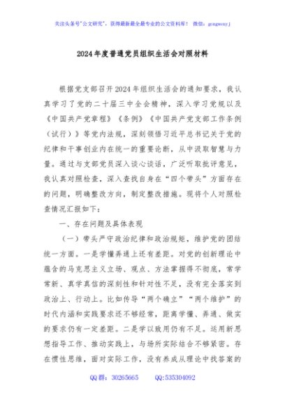 / 2024年度普通党员组织生活会对照材料