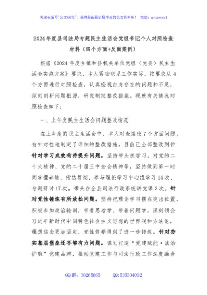 / 2024年度县司法局专题民主生活会党组书记个人对照检查材料(四个方面+反面案例)