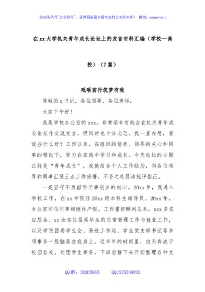 (7篇)在xx大学机关青年成长论坛上的发言材料汇编(学校—高校)