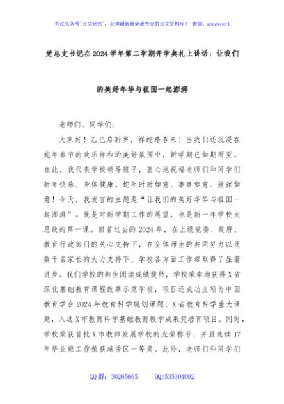 党总支书记在2024学年第二学期开学典礼上讲话:让我们的美好年华与祖国一起澎湃