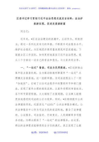 / 区委书记学习贯彻习近平法治思想交流发言材料:法治护航新征程,促进发展谱新篇