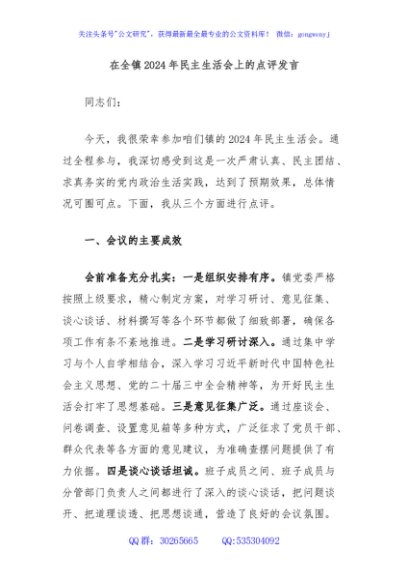 / 在全镇2024年民主生活会上的点评发言