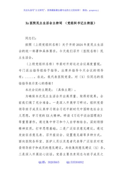 / Xx医院民主生活会主持词 (党组织书记主持版)