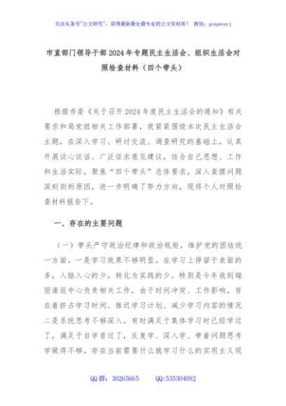 / 市直部门领导干部2024年专题民主生活会、组织生活会对照检查材料(四个带头)
