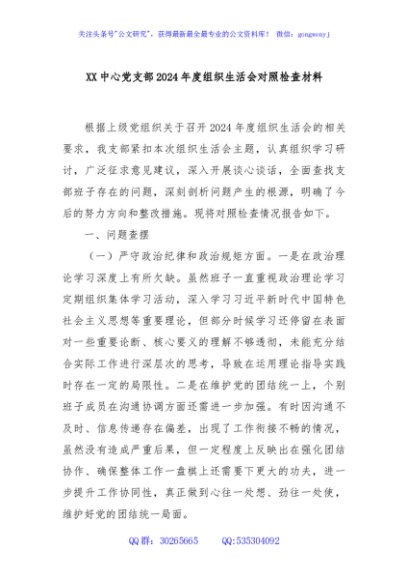 / XX中心党支部2024年度组织生活会对照检查材料