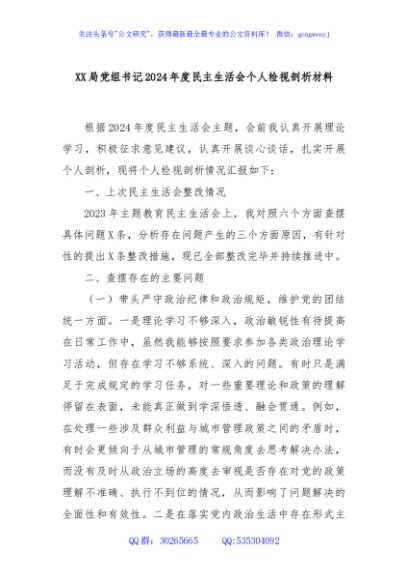 / XX局党组书记2024年度民主生活会个人检视剖析材料
