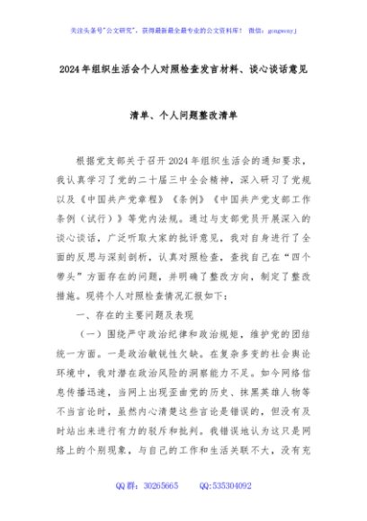 / 2024年组织生活会个人对照检查发言材料、谈心谈话意见清单、个人问题整改清单