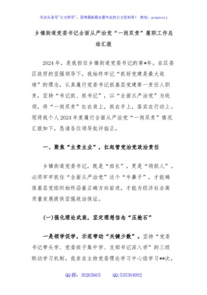 / 乡镇街道党委书记全面从严治党“一岗双责”履职工作总结汇报
