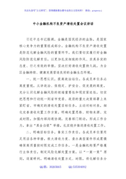 / 中小金融机构不良资产清收处置会议讲话