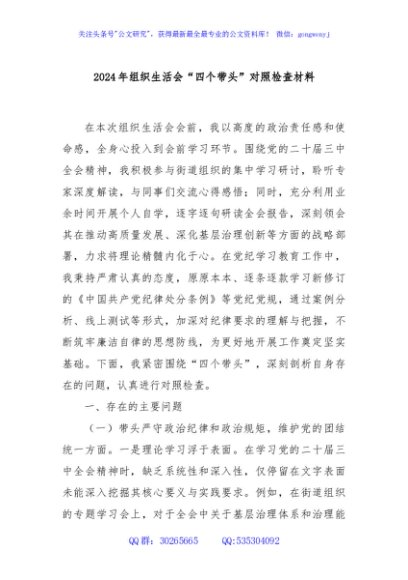 2024年组织生活会个人对照检查发言材料(四个带头)