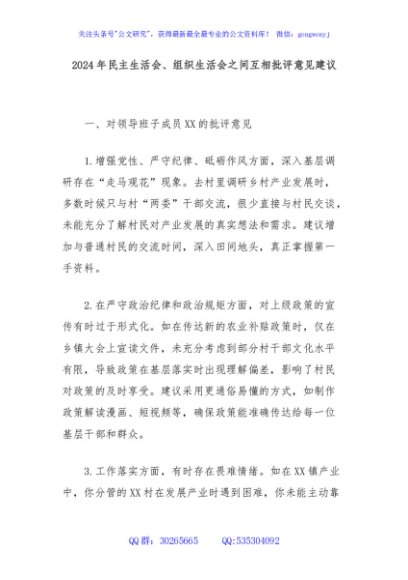 / 2024年民主生活会、组织生活会之间互相批评意见建议
