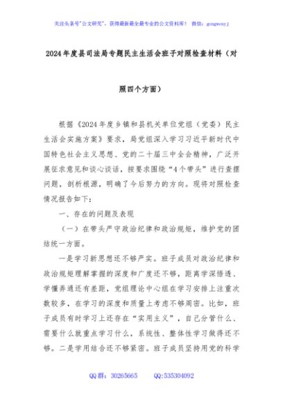 / 2024年度县司法局专题民主生活会班子对照检查材料(对照四个方面)