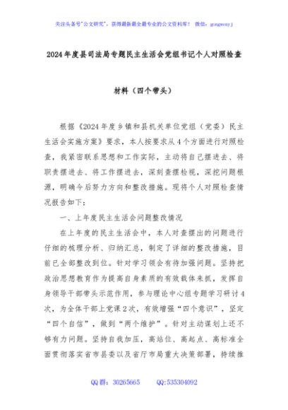 / 2024年度县司法局专题民主生活会党组书记个人对照检查材料(四个带头)