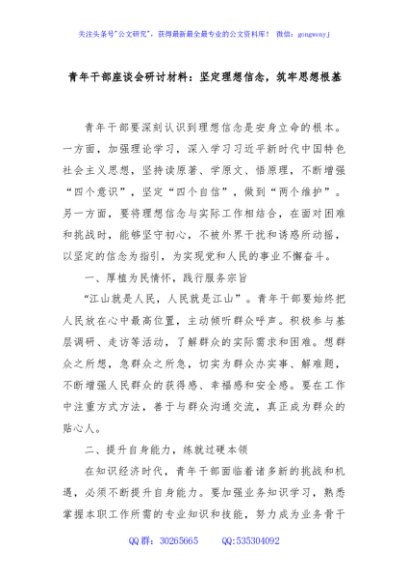 / 青年干部座谈会研讨材料:坚定理想信念,筑牢思想根基