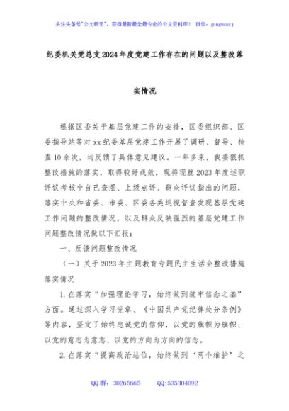 / 纪委机关党总支2024年度党建工作存在的问题以及整改落实情况
