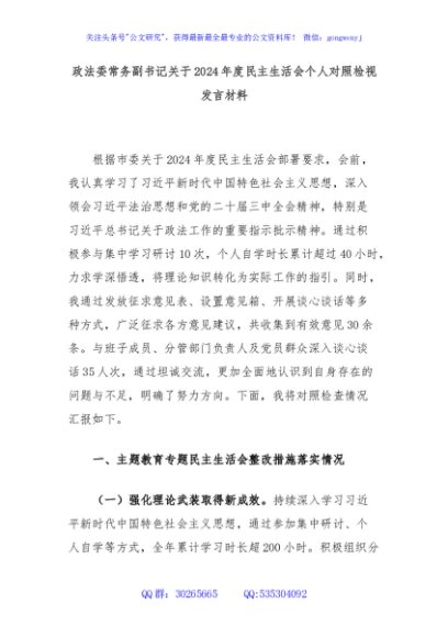 / 政法委常务副书记关于2024年度民主生活会个人对照检视发言材料