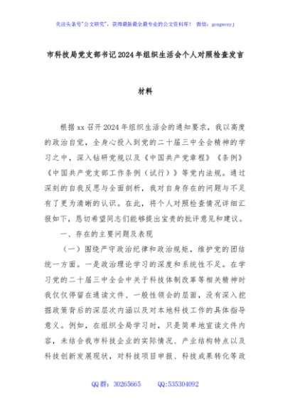 / 市科技局党支部书记2024年组织生活会个人对照检查发言材料