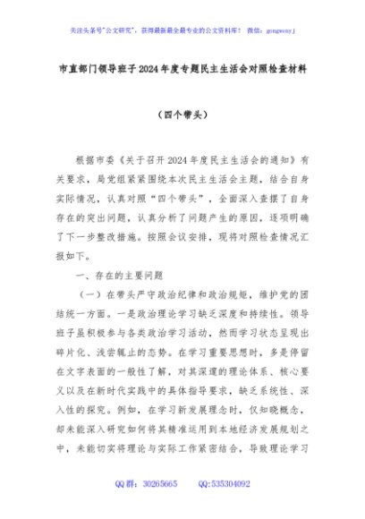 / 市直部门领导班子2024年度专题民主生活会对照检查材料(四个带头)