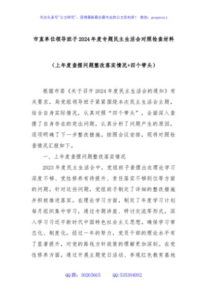 / 市直单位领导班子2024年度专题民主生活会对照检查材料(上年度查摆问题整改落实情况+四个带头)