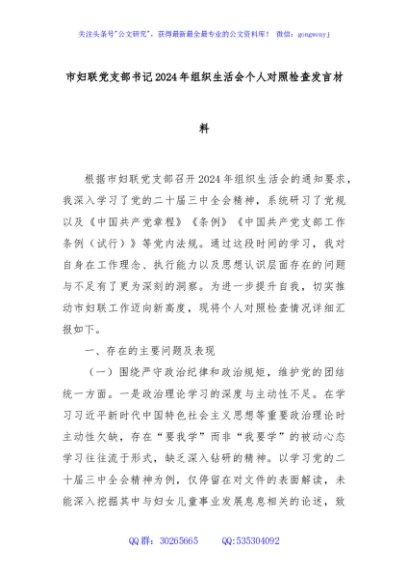 / 市妇联党支部书记2024年组织生活会个人对照检查发言材料