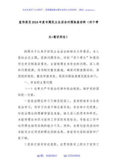 / 宣传委员2024年度专题民主生活会对照检查材料(四个带头+意识形态)