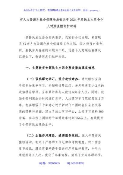 / 市人力资源和社会保障局局长关于2024年度民主生活会个人对照查摆剖析材料