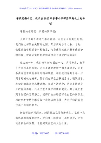 学校党委书记、校长在2025年春季小学部开学典礼上的讲话