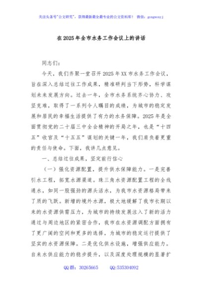/ 在2025年全市水务工作会议上的讲话