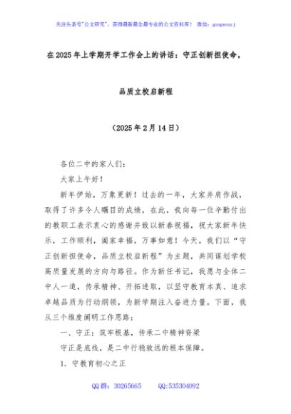 / 在2025年上学期开学工作会上的讲话:守正创新担使命,品质立校启新程